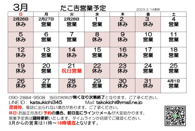 3月は休みが多いですが(いつもかもしれませんが)、どうぞよろしくお願いいたします。 |