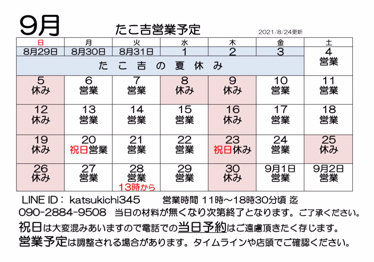 9月の営業予定です