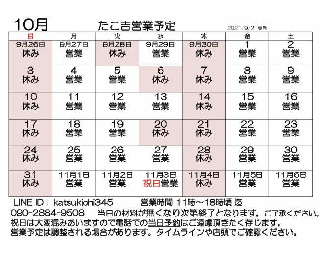 11月の営業予定