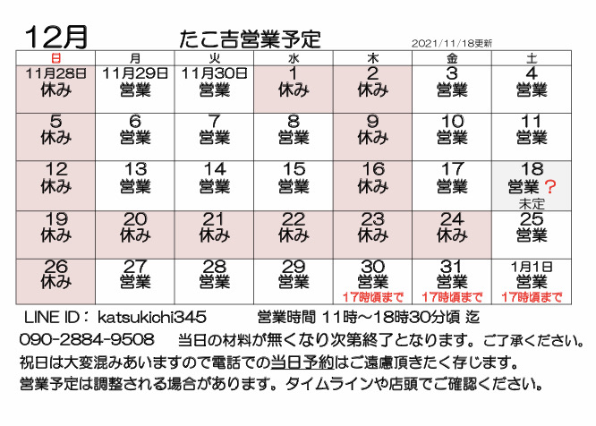 11月の営業予定です