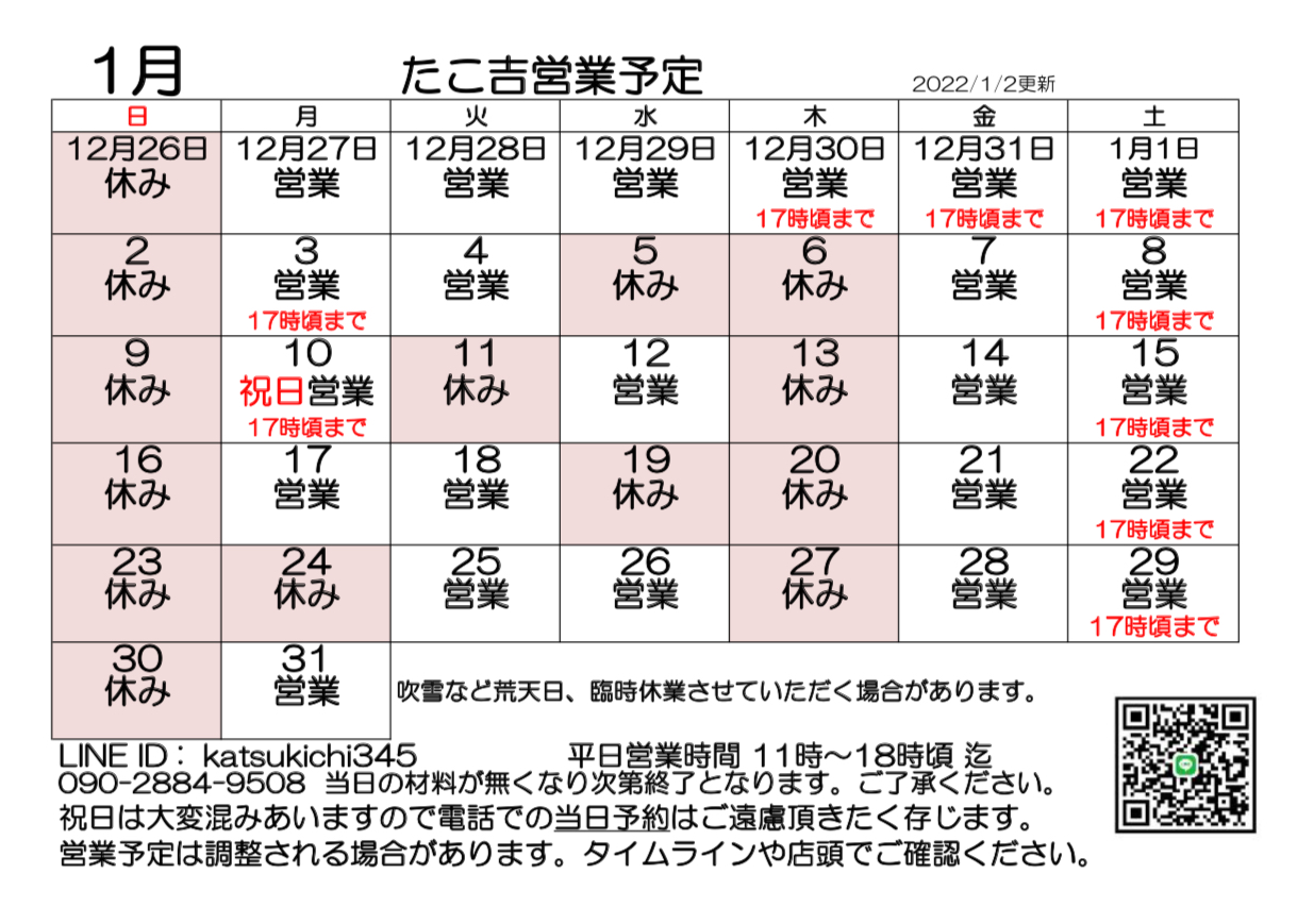 1月の営業予定